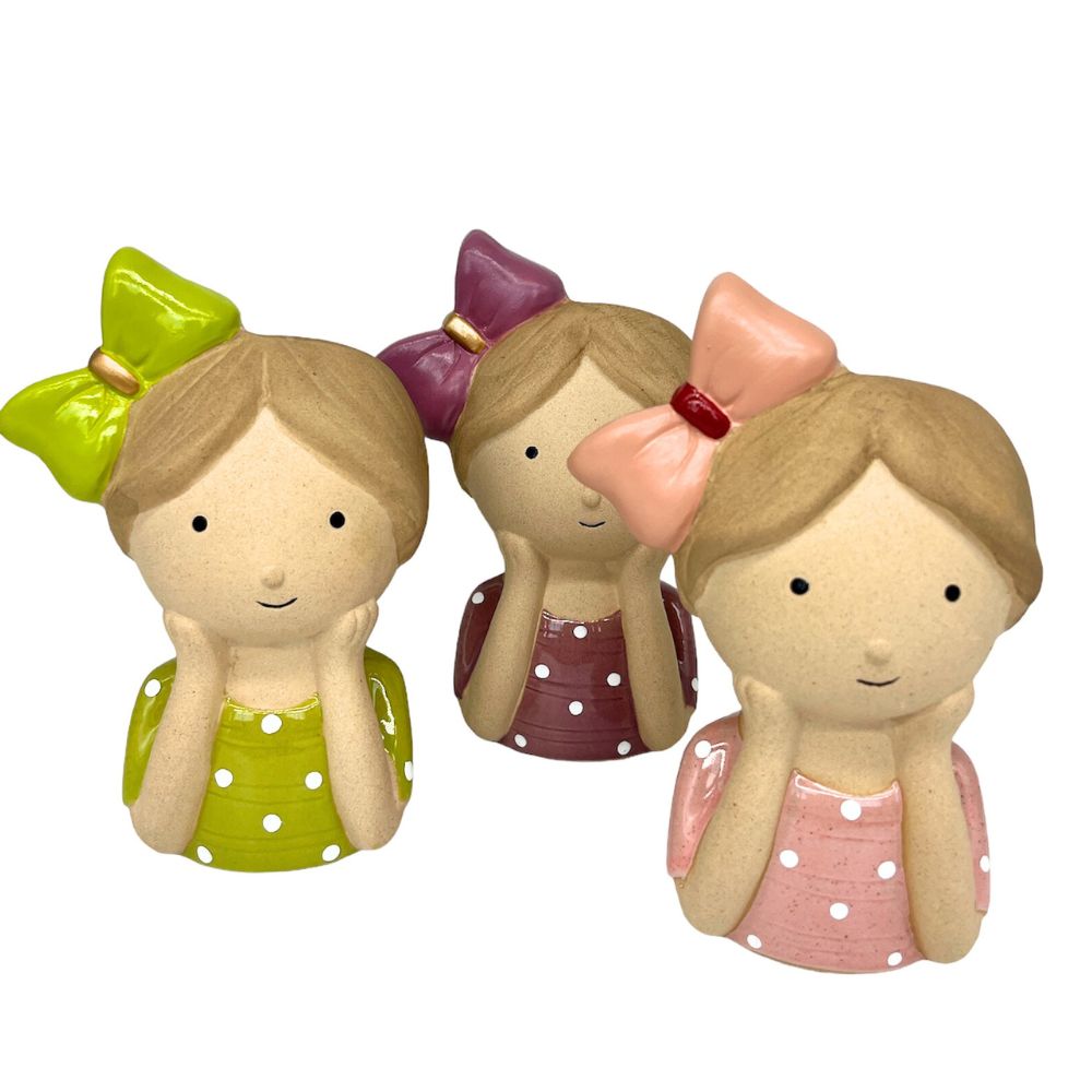 In tre colori assortiti verde, rosa e fucsia questa simpatica figura è un piccolo ricordo allegro che su richiesta può essere completato cin una decorazione di fiori.