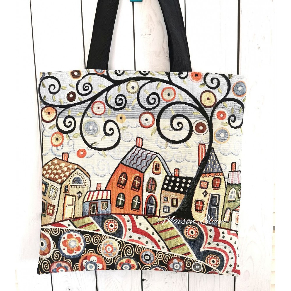 Realizzata a mano questa borsa in tessuto robusto con un disegno paesaggio stilizzato.