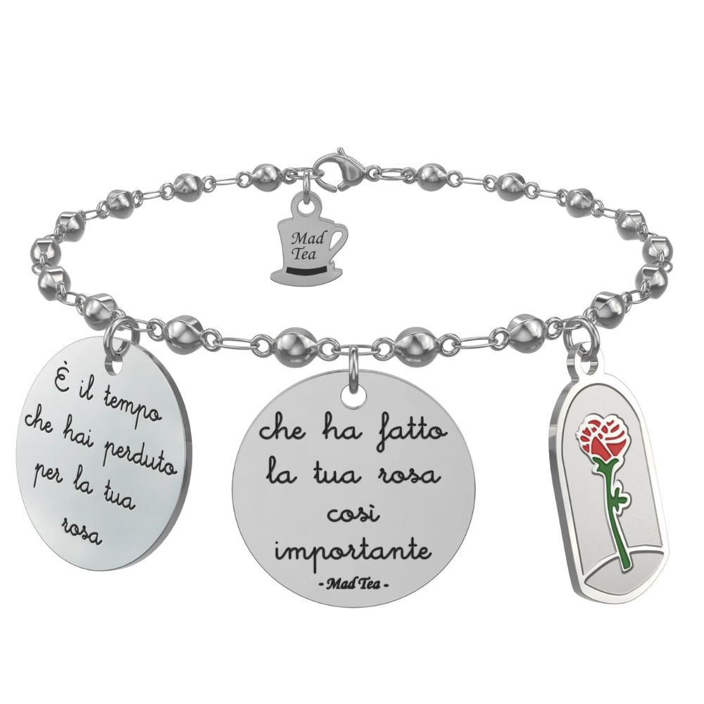 Bracciale composto dalla rosa del Piccolo Principe e da due targhette con incisa la frase “È il tempo che hai perduto per la tua rosa che ha fatto la tua rosa così importante”.