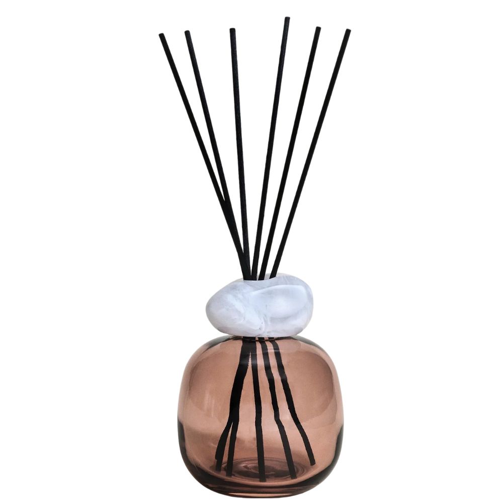 Con la sua bottiglia di vetro color prugna, dalle curve morbide e organiche, apporta un tocco di morbidezza e modernità ai vostri interni. È valorizzato da un anello effetto marmo bianco che aggiunge una nota di eleganza minerale.