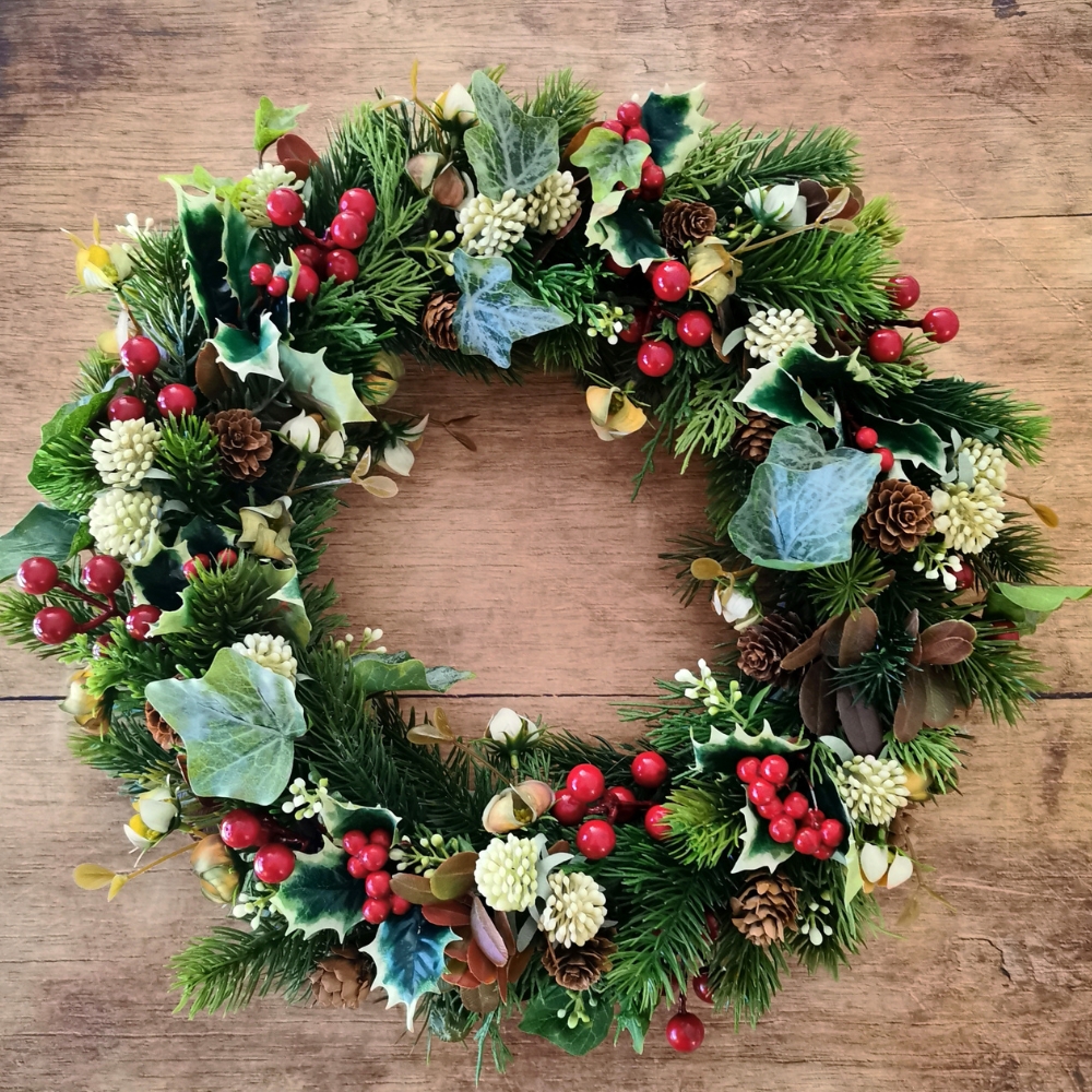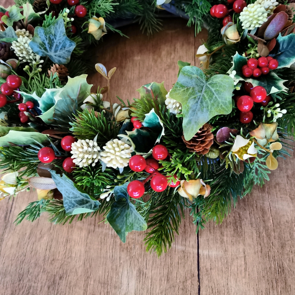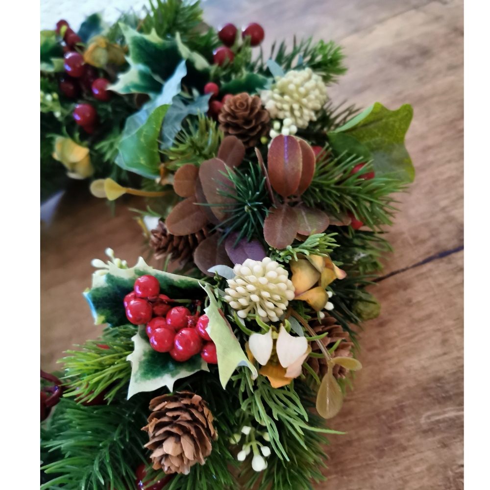 Una ghirlanda decorata a tuttotondo con base in legno di vite.