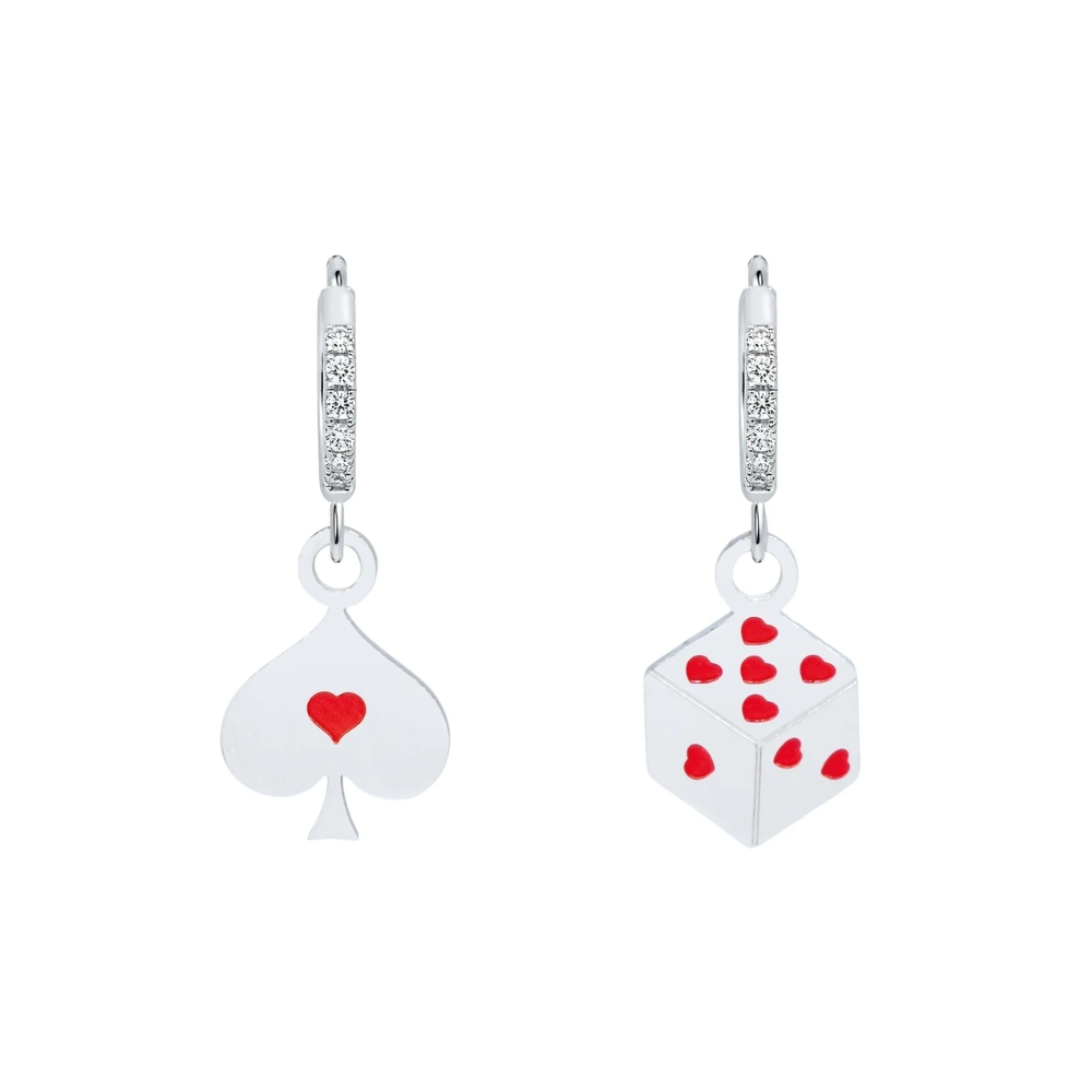 Questi orecchini nascono da un gioco di prestigio del Cappellaio Matto, maestro del paradosso e della meraviglia. Da un lato, una picca, emblema della sua folle genialità, custodisce un piccolo cuore rosso, a ricordarci che l’amore più vero è quello che sa essere un po’ folle. Dall’altro, un dado che non lascia nulla al caso: ogni faccia è segnata da piccoli cuori rossi, perché anche nell’assurdo più totale, il cuore resta l’unica regola che vale davvero.