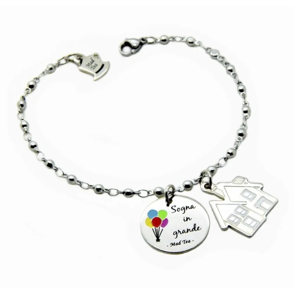Un bellissimo bracciale con doppio ciondolo: una casetta e la frase "Sogna in grande" che ricorda il film UP e la sua magia.